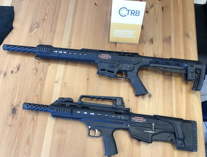 Espingardas 12GA semi-auto da DECIMA com canos semelhantes mostrando a redução do total comprimento do modelo bullpup